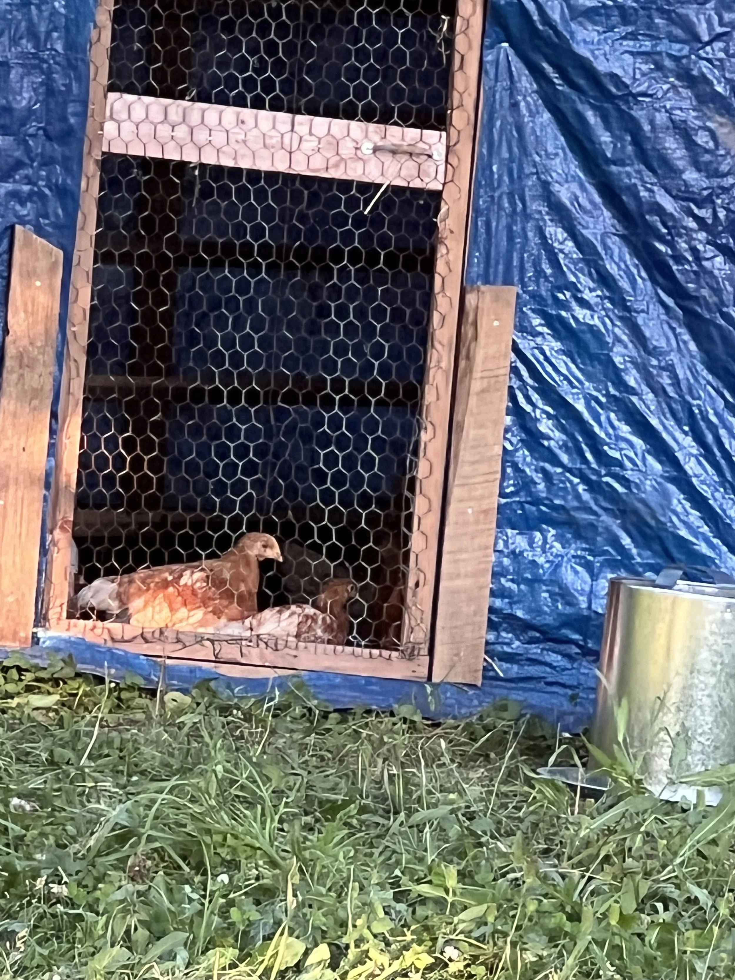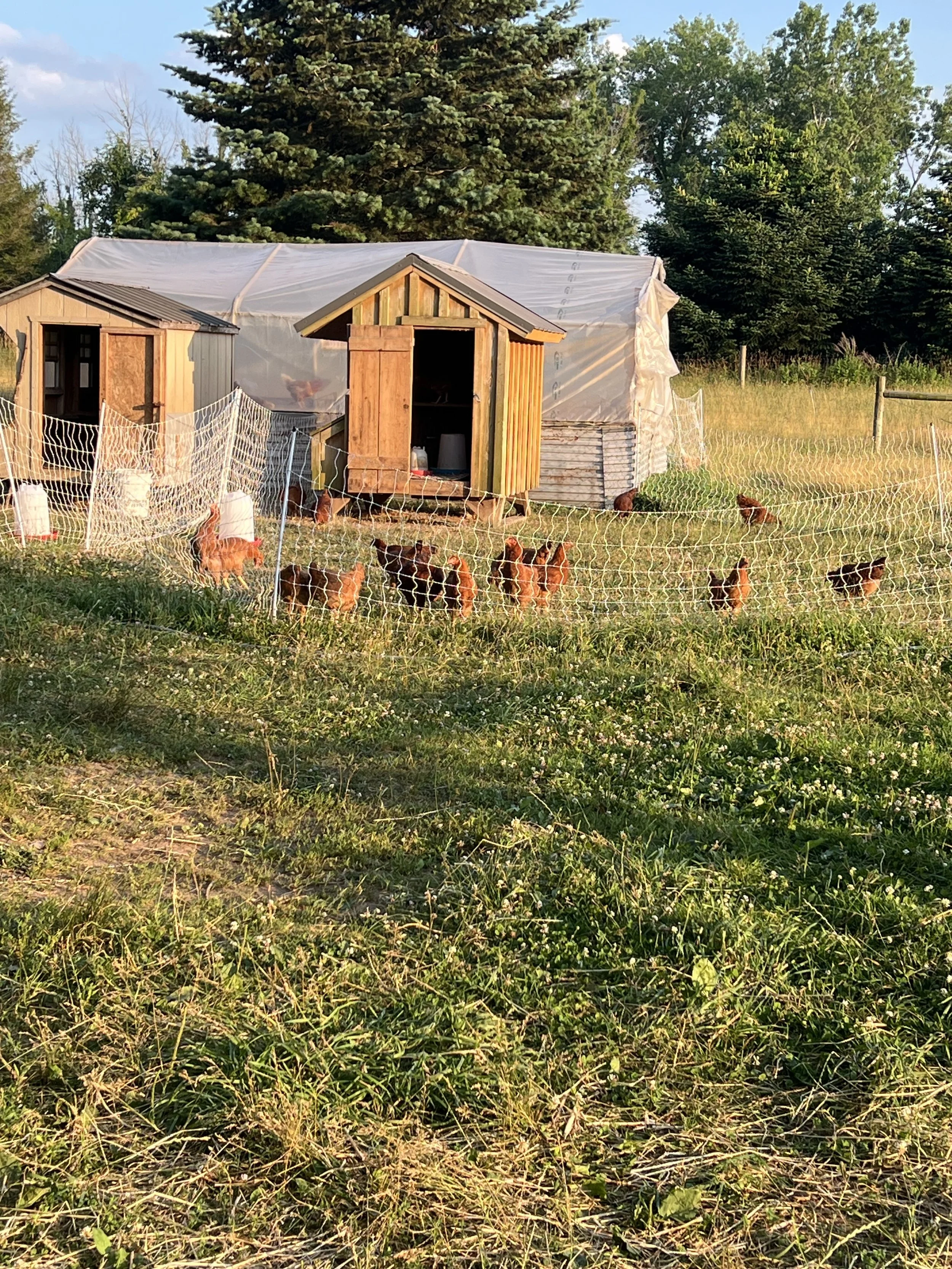 We raise free range chickens in runs and solar fencing .  They are in coops at night and when the weather is bad.  In 2023 Jerry built a greenhouse coop which helps them have light and keeps them warm in the winter.  We sell the brown eggs by the dozen at the farm and the farmers markets. We currently have 100 chicks that will start laying in late October
