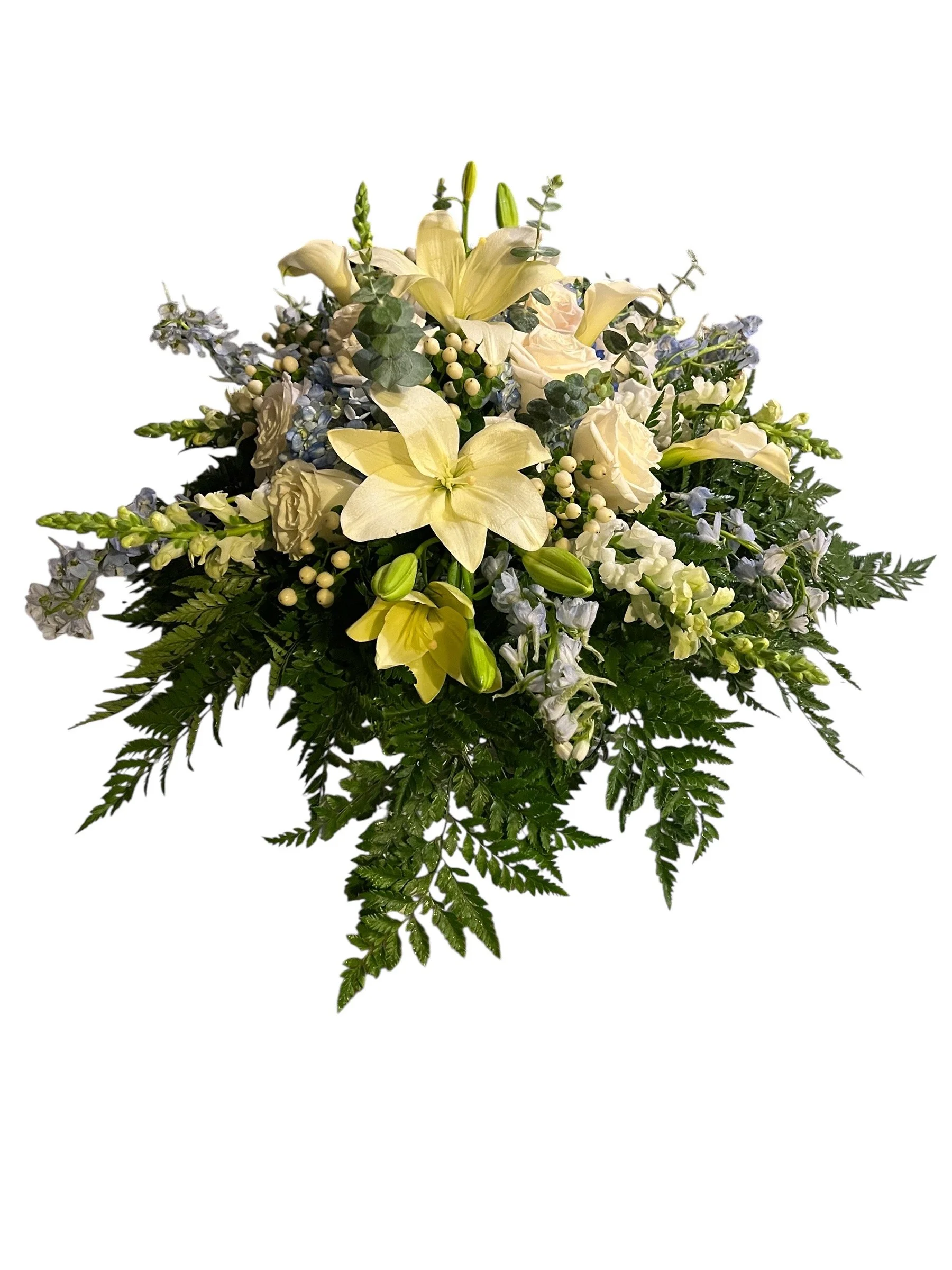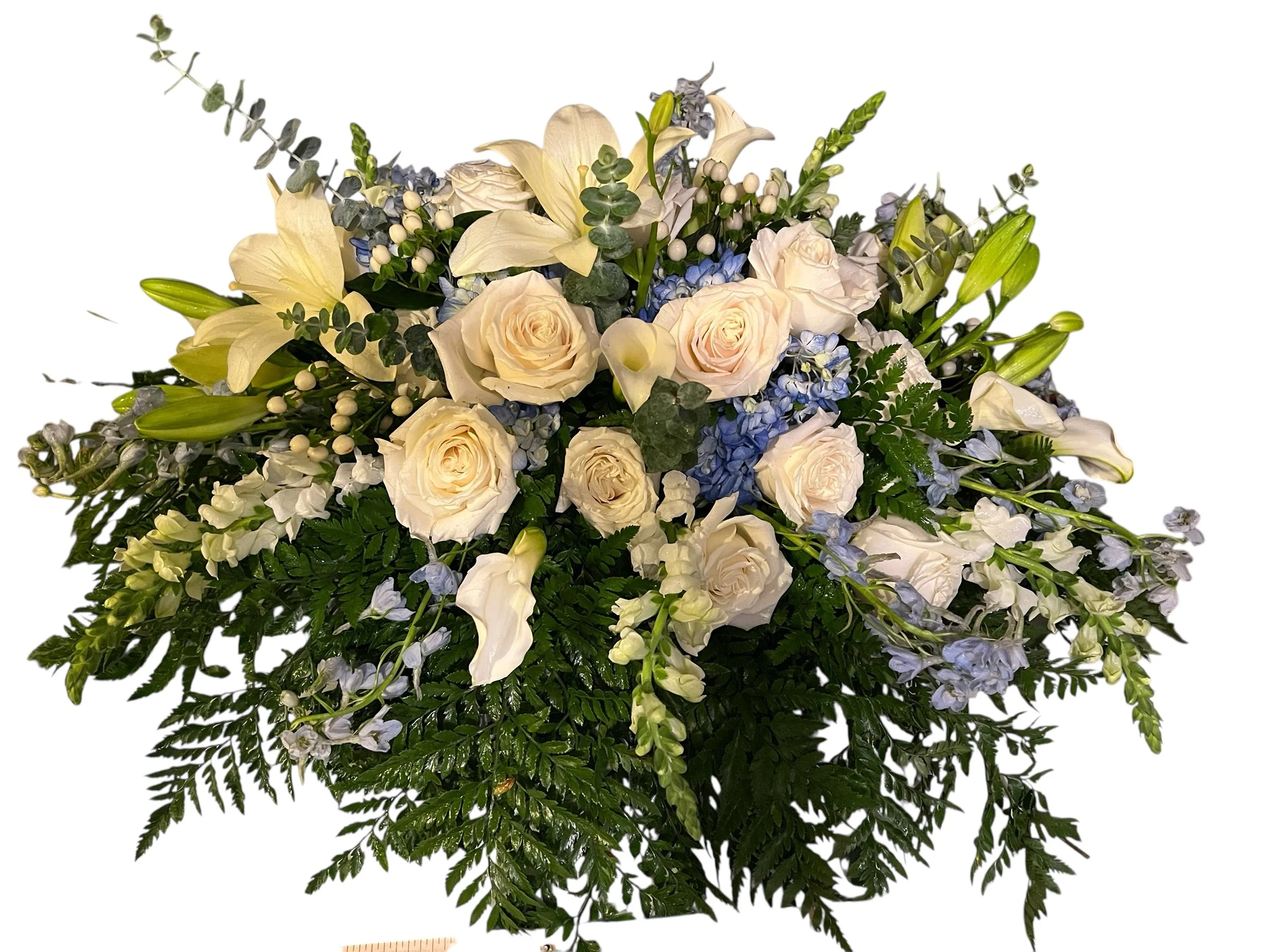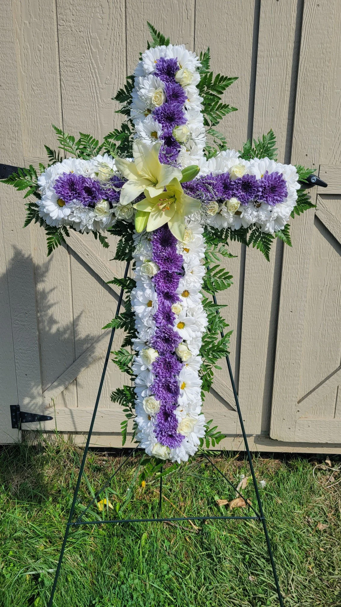 A 20” wreath made with carnations and roses. Price includes stand as well.